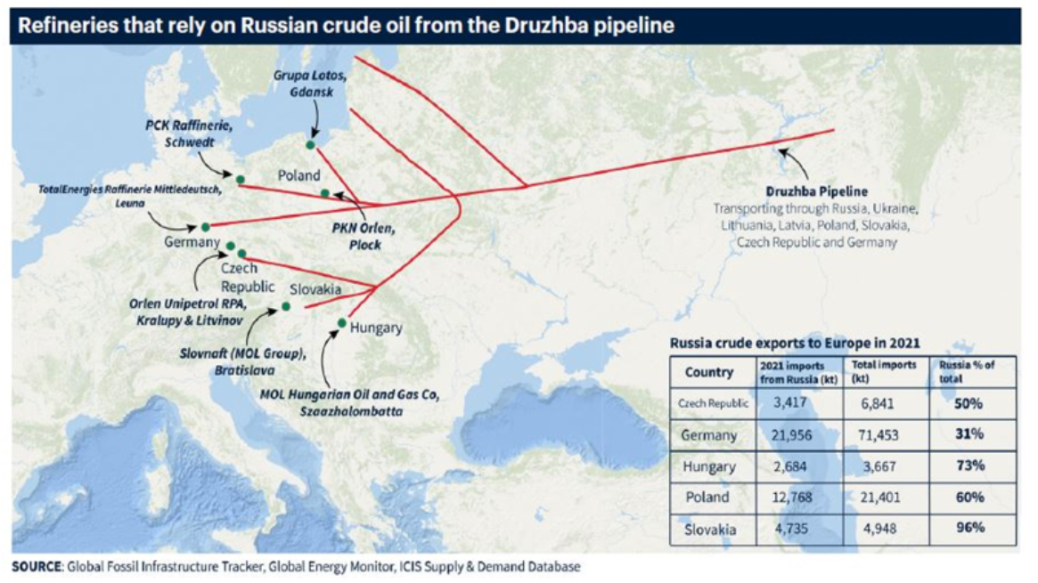 Sämtliche Raffinerien in Ungarn, der Slowakei, der Tschechischen Republik, Polen, Ostdeutschland (Leuna) und Österreich erhielten keinen Feedstock mehr für die Erzeugung von Petrochemikalien aus Erdgas und Erdöl. Die Versorgung großer Teile Europas mit Basischemikalien wäre damit massiv unter Druck. Gleichzeitig würden mit einem Embargo vermutlich auch alle Grundchemikalien wie Anorganika und Petrochemikalien wegfallen, die aus Russland importiert werden.