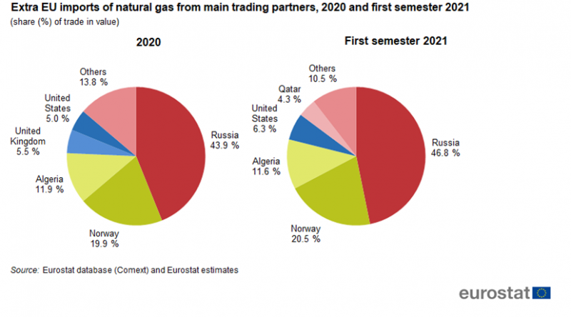 Eurostat stammen im Jahr 2020 rund 44 Prozent der europäischen Erdgasimporte aus Russland. Im ersten Halbjahr 2021 stieg dieser Anteil auf fast 47 Prozent. Österreich bezog 2021 laut