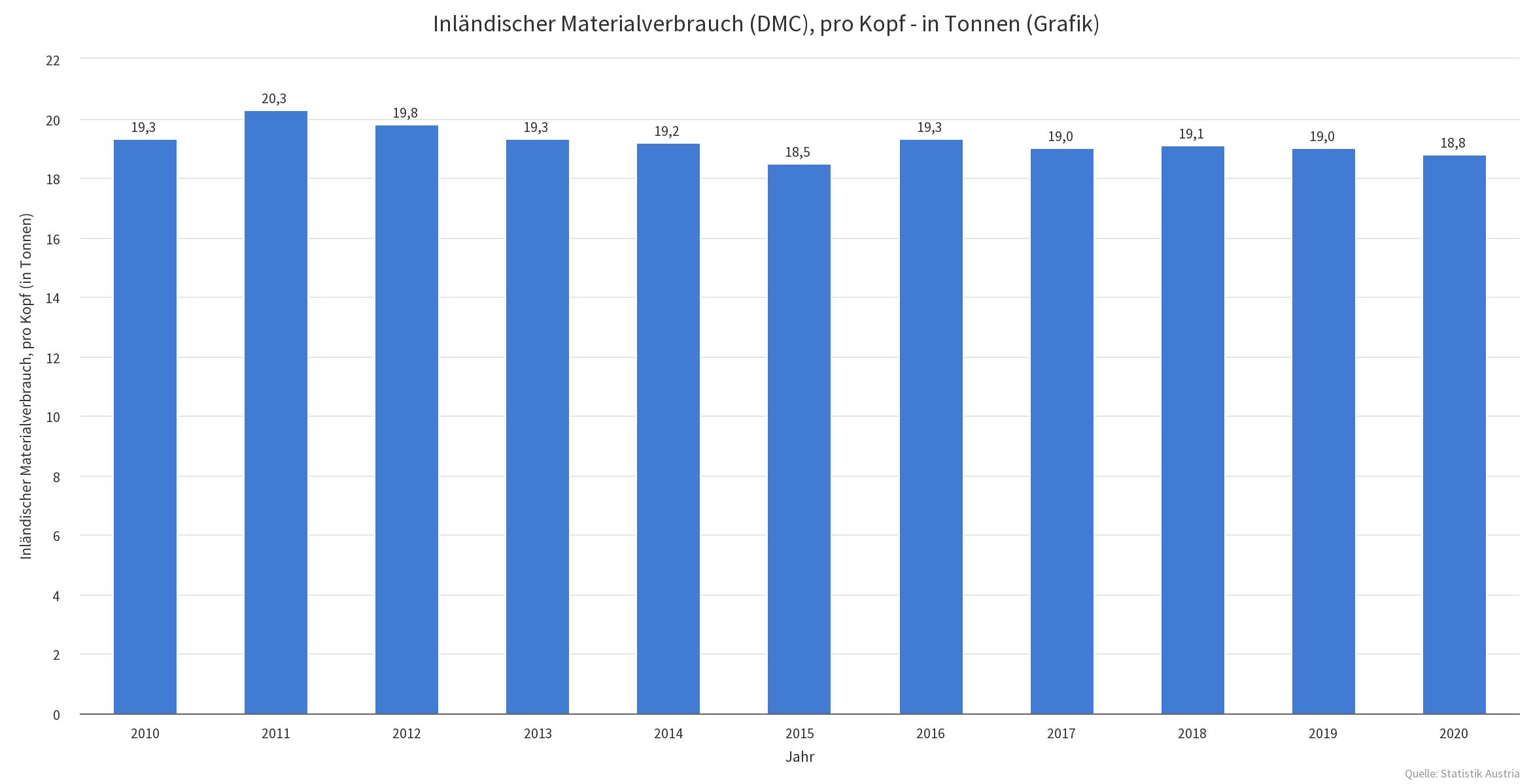 Österreich hat im internationalen Vergleich einen hohen Verbrauch an Rohstoffen. Der inländische Materialverbrauch (Biomasse, metallische Erze, nichtmetallische Minerale, fossile Energieträger) liegt laut nationaler Daten bei rund 19t/Kopf und ist damit deutlich höher als der Durchschnitt der EU-28 mit rund 14t/Kopf.