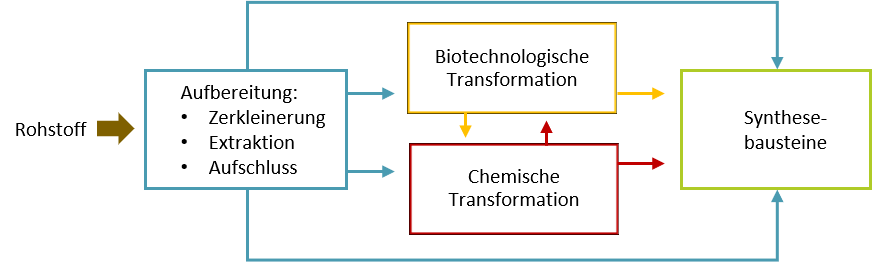 Nachwachsende Rohstoffe beinhalten aus biotechnologischer Sicht eine Synthesevorleistung der Natur, die je nach Rohstoff auf unterschiedliche Weise genutzt werden kann. So können Inhaltsstoffe aus nachwachsenden Rohstoffen entweder direkt genutzt werden oder sie müssen mithilfe verschiedener Verfahren in geeignete Rohstoffe, sogenannte Plattformchemikalien, umgewandelt werden.