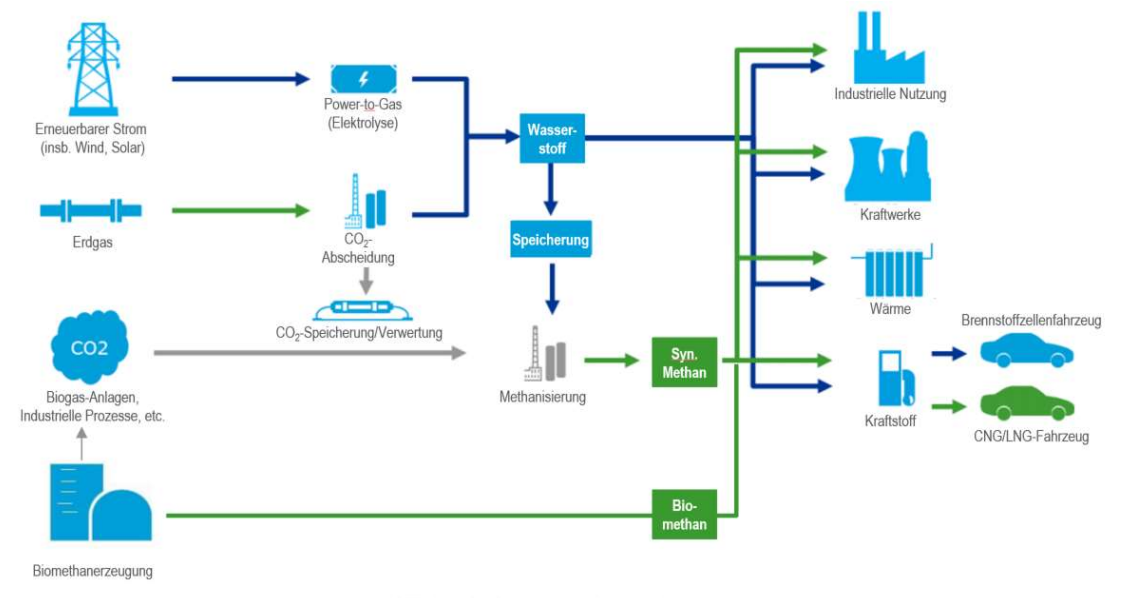 Wasserstoff bietet in diesem Zusammenhang die Möglichkeit, mit Hilfe der Power-to-Gas Technologie (PtG) erneuerbare Energien über das Erdgasnetz an Verbraucher und Gasspeicher zu liefern. In einem zusätzlichen Prozessschritt lassen sich weitere Energieträger herstellen.